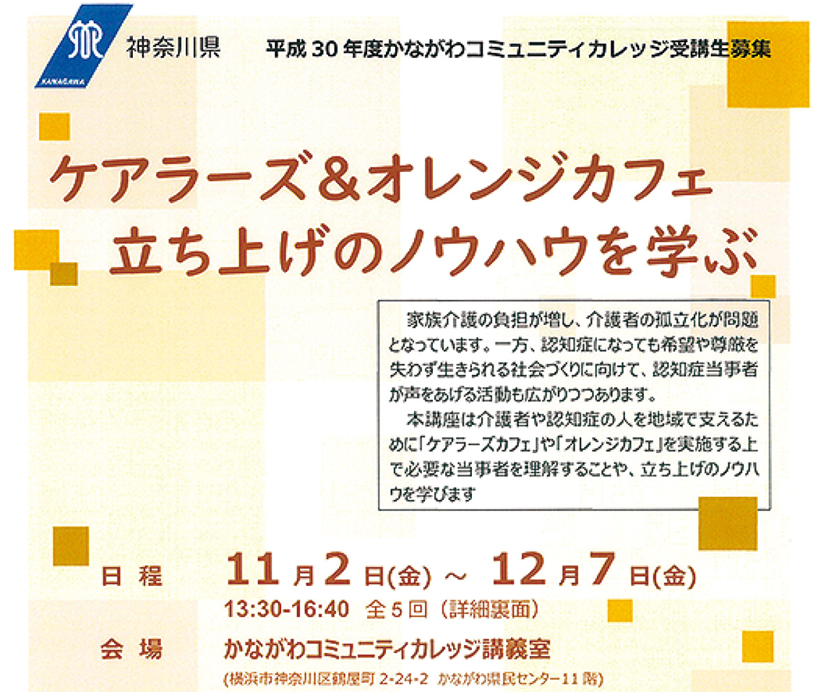 かながわコミュニティカレッジは、11月2日から12月7日(毎週金曜)まで「ケアラーズ&オレンジカフェ立ち上げのノウハウを学ぶ」と題した講座を全5回で開講する。各回とも午後1時半から4時40分まで。受講料7500円となる。