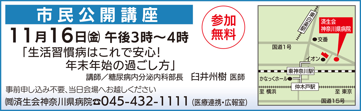 11月14日の「世界糖尿病デー」にちなみ、JR東神奈川駅そばにある済生会神奈川県病院で11月16日(金)午後3時から5時まで、関連イベントが開催される。