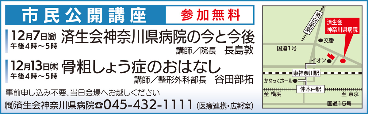 東神奈川駅そばにある済生会神奈川県病院で12月7日(金)と13日(木)、市民公開講座が開催される。時間は午後4時から5時まで。