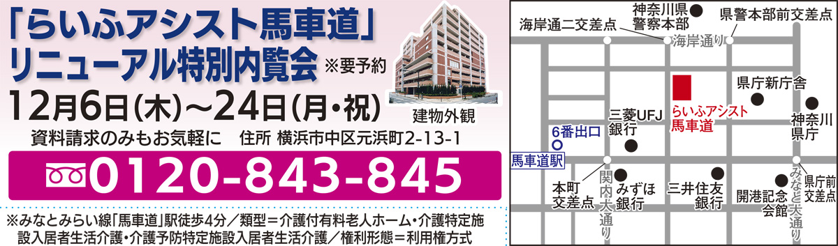 介護付有料老人ホーム「らいふアシスト馬車道」(横浜市中区元浜町2の13の1)は「馬車道」駅から徒歩4分(320m)。山下公園、横浜中華街、赤レンガ倉庫などの名所が徒歩圏内。入居者の家族が仕事帰りや買物の際に立ち寄りやすいのも嬉しいポイントだ。