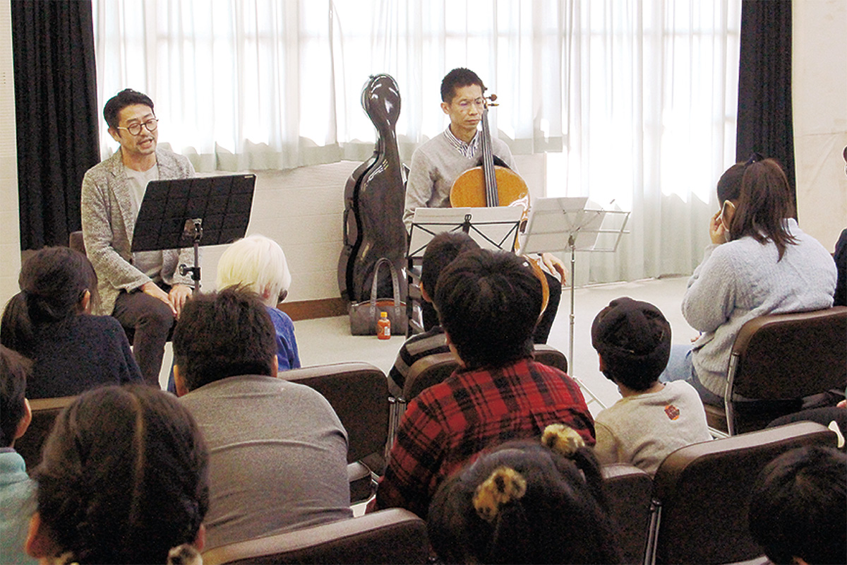 かなっくホールで地域とアーティストを繋げている齊藤実雪さんが同学校と打ち合わせを行い、アーティストを紹介することで実現。今回は、舞台やテレビ出演をしている役者の伊原農さんと東京都交響楽団に所属するチェロ奏者の長谷部一郎さんが招かれ、宮沢賢治作の『銀河鉄道の夜』を披露した。