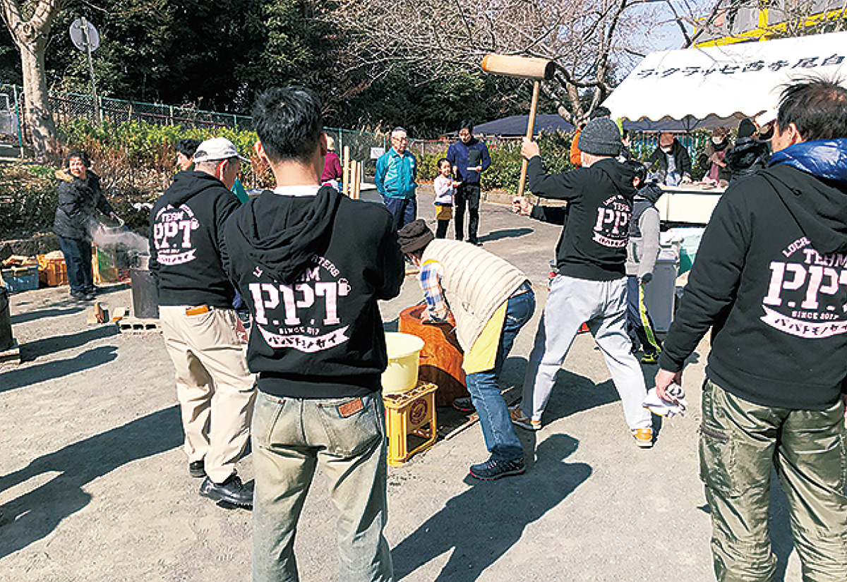 同自治会は高齢者が多いため、地域支援を掲げるパパ友の会に参加を依頼。当日はメンバーたちが準備から餅つき、片付けまでを手伝った。