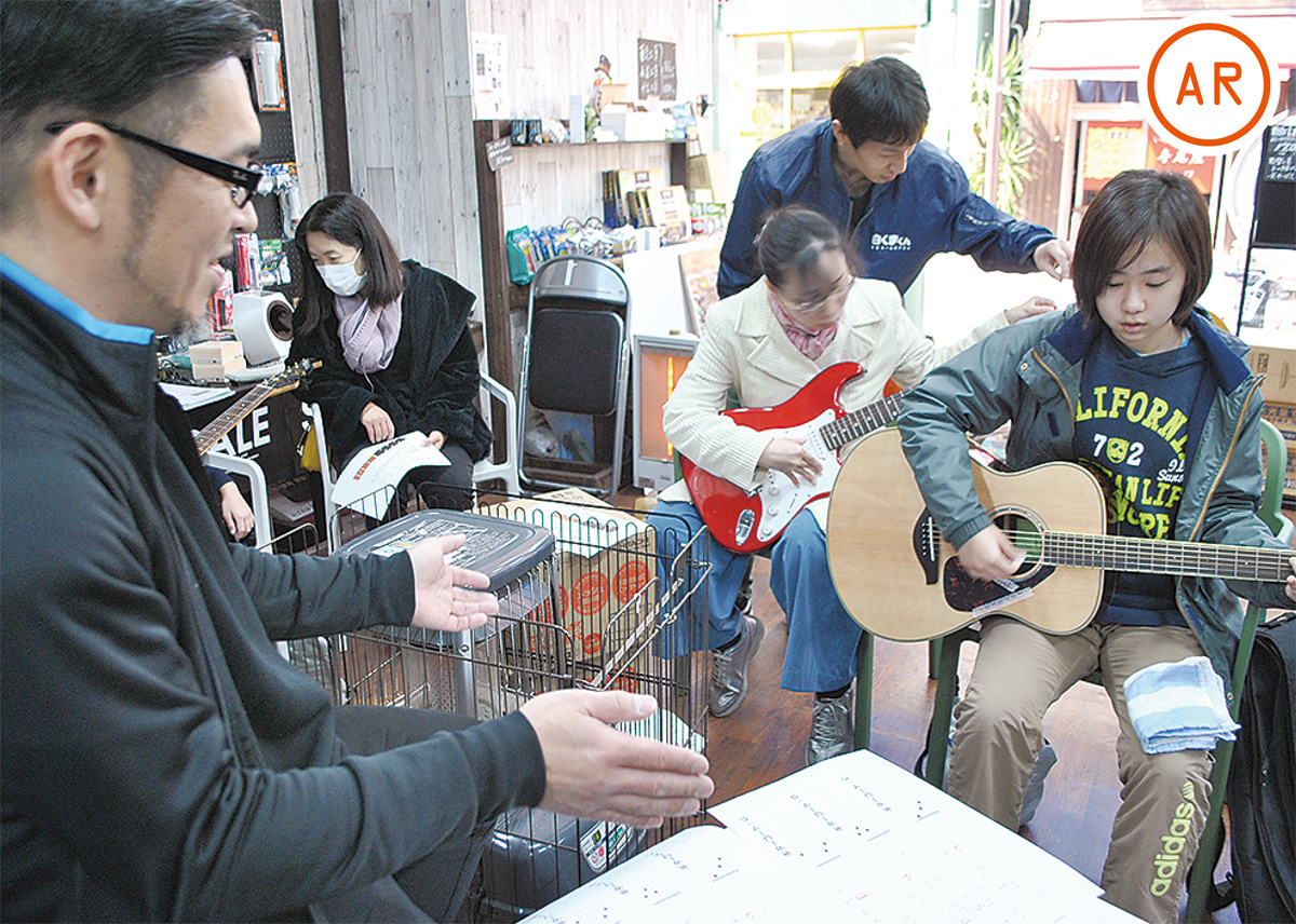 大口あけぼの通商店会に所属する十字屋家電株式会社で3月16日、「電気屋さんのギター講座」が行われた。