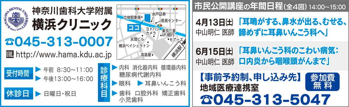横浜駅西口徒歩5分にある神奈川歯科大学附属横浜クリニックは4月13日(土)、「耳鳴りがする、鼻水が出る、むせる、諦めずに耳鼻いんこう科へ」と題した市民公開講座を開く。同クリニック7階大会議室が会場。時間は午後2時から3時まで(受付は1時半〜)。費用は無料で講師には、同クリニックで耳鼻いんこう科を担当する中山明仁大学院教授が登壇する。