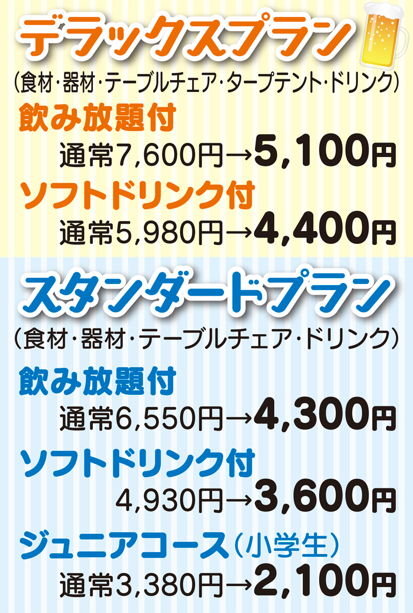 期間中は食材、器材、テーブルチェアに飲み放題(3h)の付いたスタンダードプランが通常6550円のところ4300円になるなど大変お得。