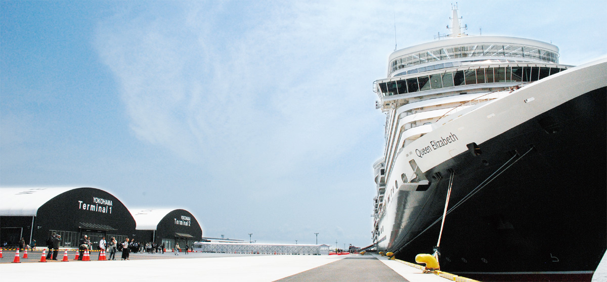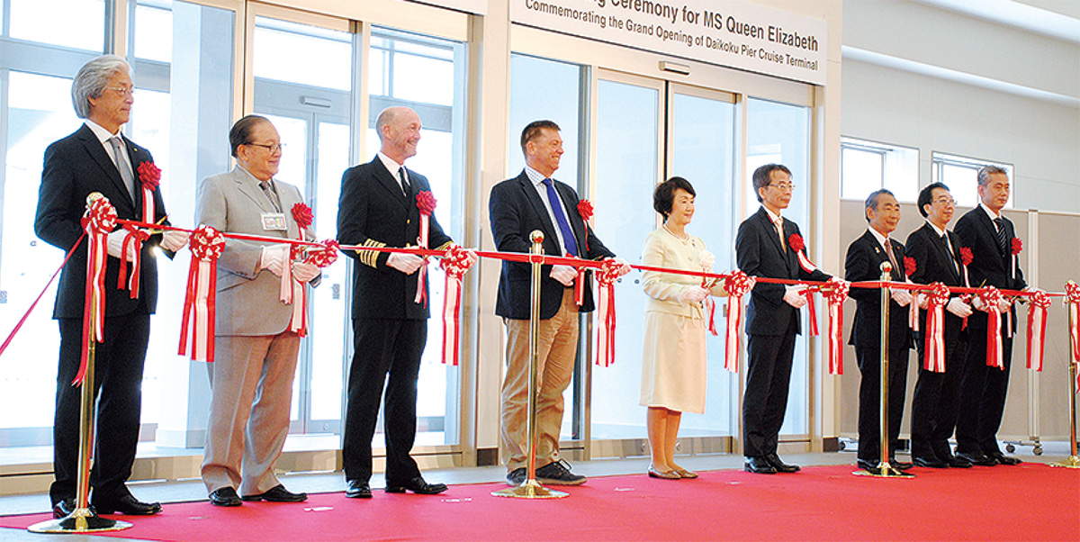 横浜ベイブリッジをくぐれない超大型客船のために整備された大黒ふ頭客船ターミナル=鶴見区大黒ふ頭13=が、このほどグランドオープンした。4月19日には、英船籍で世界的人気を誇る豪華客船「クイーン・エリザベス」(QE/9万900トン)が第1船として3年ぶりに着岸。記念セレモニーに華を添えた。