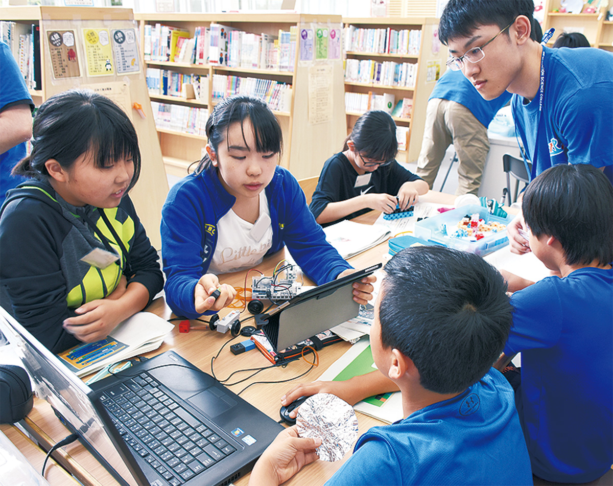この授業は(一社)横浜すぱいすの古川三千代さんの協力で実施されているもの。5、6年生は外部講師から、1〜4年生は各担任教諭による指導を受け、プログラミングの基礎とともに自ら学ぶ主体性を育んでいる。