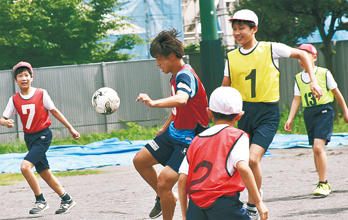 区民DAY開催を前に、横浜FCの武田英二郎選手と斉藤光毅選手が区内にある斎藤分小学校を訪問し、5、6年生と交流するイベント「ワクワク!横浜FC・小学校ふれあいTime」が7月17日に開催された。