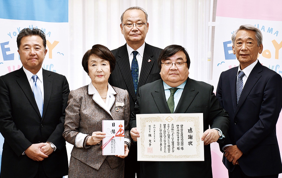 市の推進する健康寿命を伸ばす取り組み「よこはま健康スタンプラリー事業」に賛同する神奈川福祉事業協会(伊坂重憲会長)と県遊技場協同組合(同理事長)が、ラリー完了者に提供する景品300万円相当を11月11日に市に寄贈した。これに対し、林文子市長から感謝状が贈られた。
