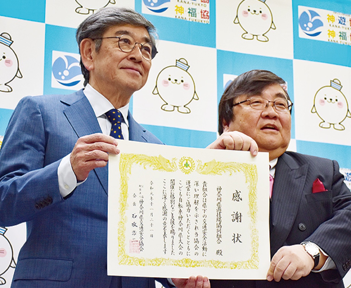県内のパチンコ店が加盟する県遊技場協同組合(伊坂重憲理事長)が、子どもの交通事故防止対策として今年7月に実施された「交通安全こども自転車神奈川県大会」に100万円を寄付したことを受け、11月14日に(公財)県交通安全協会(石坂浩二会長)から感謝状を受け取った。