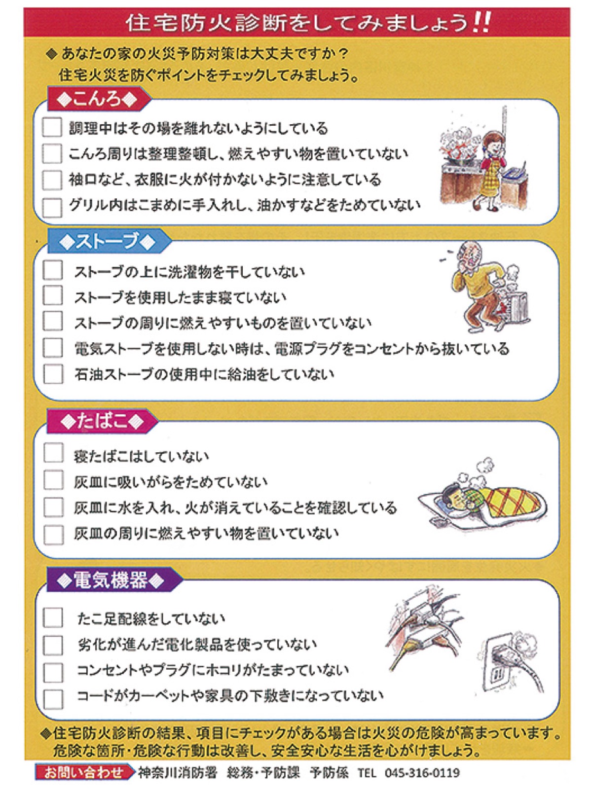 チラシには、昨年区内で急増した電気ストーブによる火災の防止策として、「電源を付けたまま寝ない」「使用時以外は電気プラグをコンセントから抜く」などの注意点を記載。これまで消防職員が希望宅に出向き実施していた「住宅防火診断」を各家庭で手軽に確認できるチェック表も設け、対策に役立ててもらう。