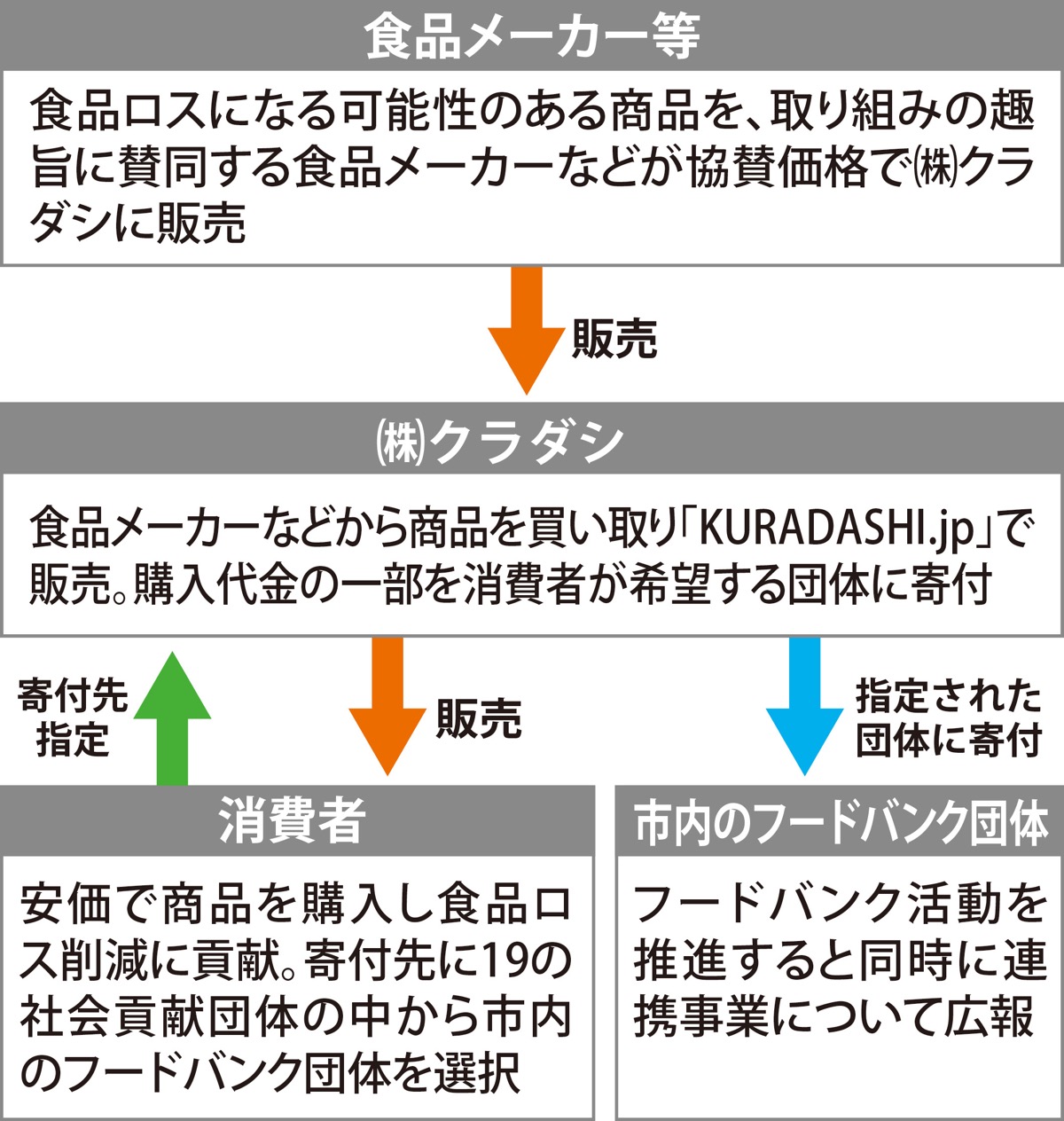 民間事業者から公民連携事業などの提案や相談を受け付ける市の制度「共創フロント」を通じてクラダシから打診を受けた同局は、食品ロスの解消と、廃棄食品を引き取り福祉施設や生活困窮者などへ無料で提供するフードバンク活動の支援につながるとして協力を決めた。