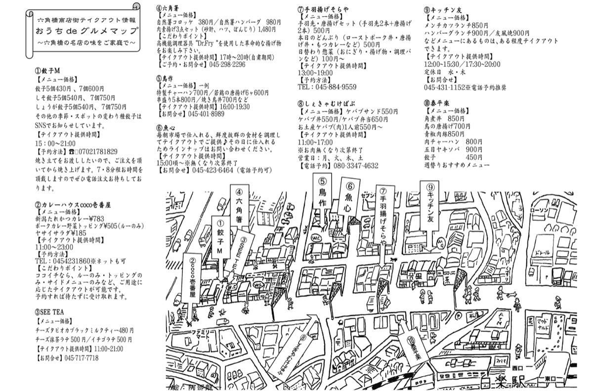 六角橋商店街では、テークアウトを実施している飲食店をまとめたホームページ「おうちdeグルメ〜六角橋の名店の味をご家庭で〜」を作成した。