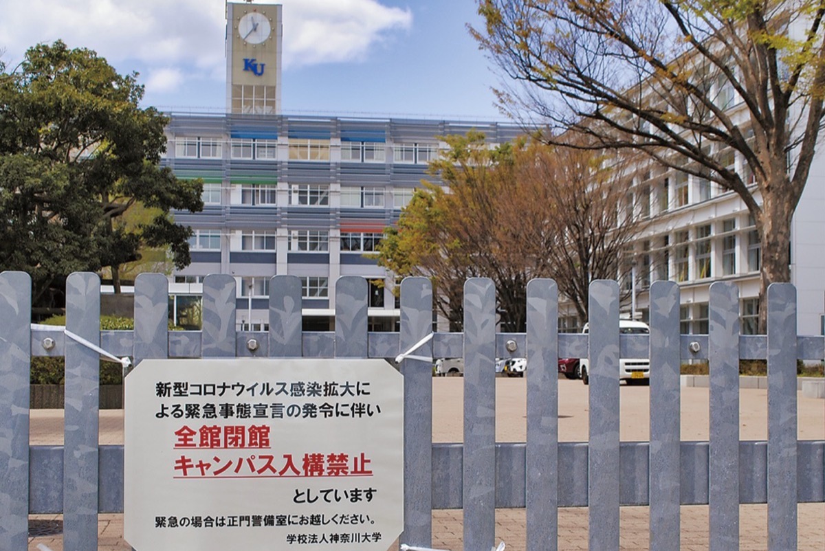 緊急事態宣言を受け「3密」を防ぐ措置として8月1日まで構内への立ち入りを禁止している神奈川大学=六角橋=では、前学期授業すべてをオンラインで行うことを決め、5月11日から遠隔での講義を実施している。