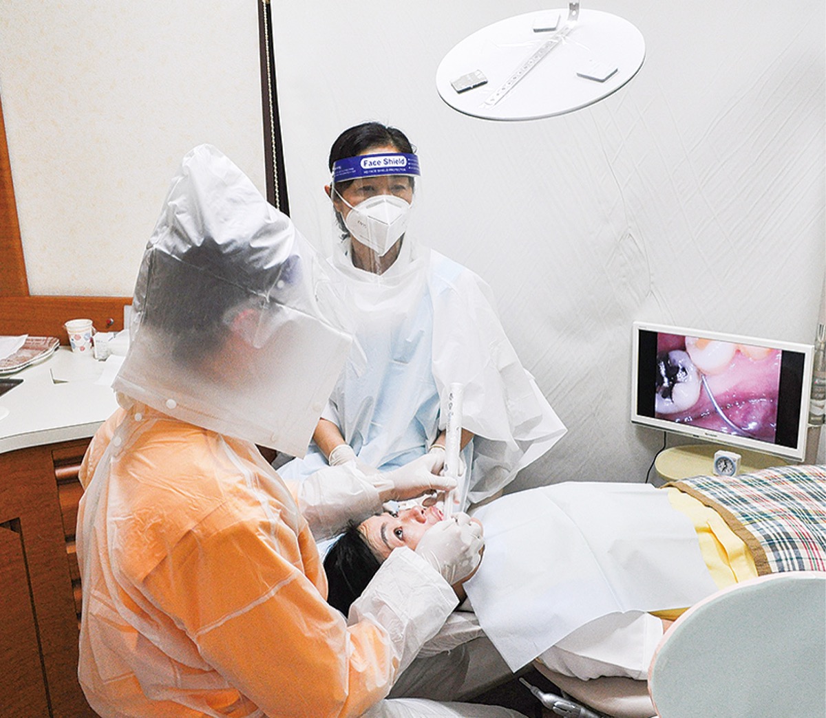 新型コロナウイルスの感染を助長する「三密」になりやすく、エアロゾルによる飛沫感染のリスクも指摘される歯科医院。藤江デンタルクリニック=入江=では、口腔内カメラを使った診療で感染リスクの軽減に努めている。