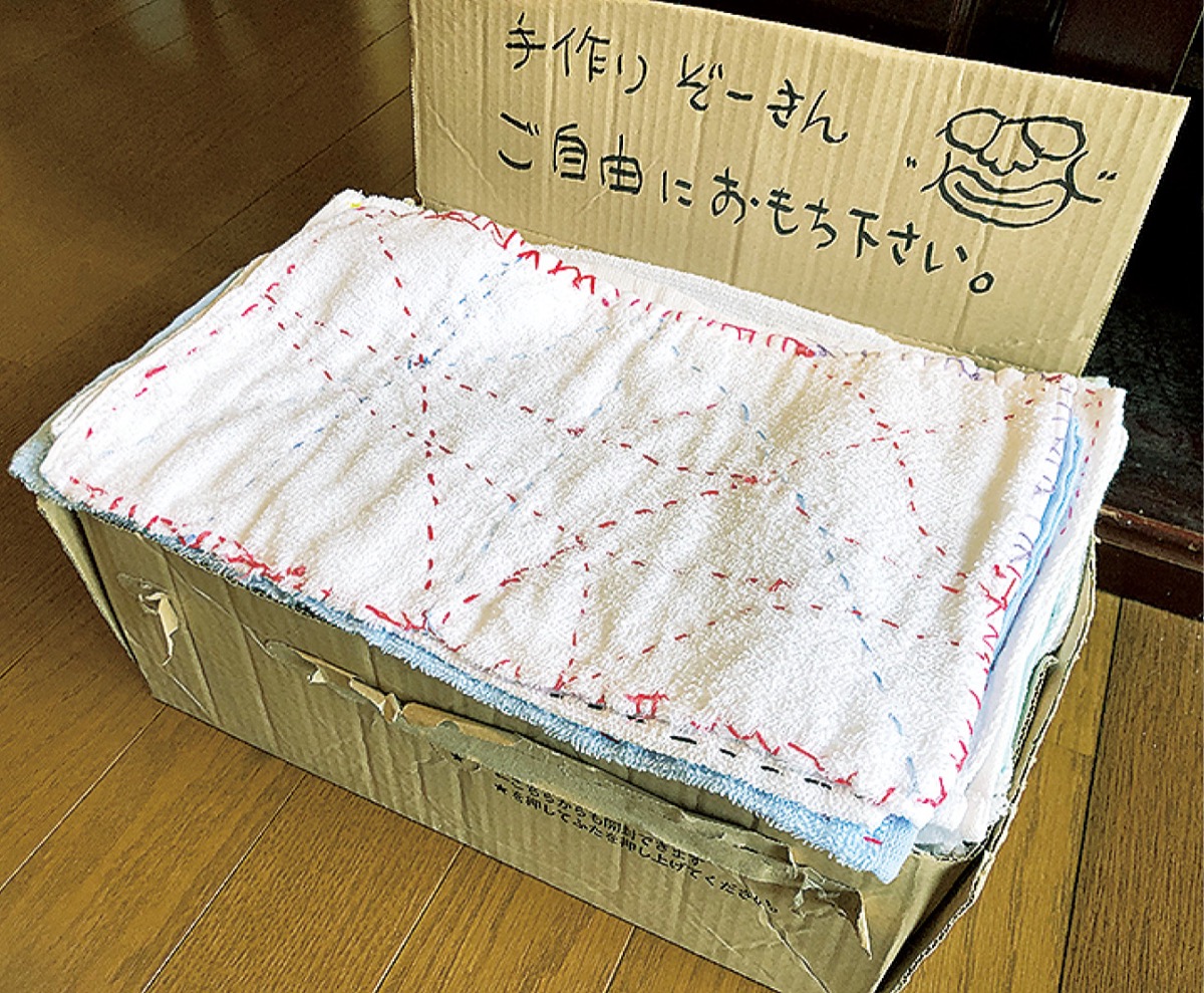 利用者は若い頃に培った裁縫技術を生かし、毎朝45分ほどの時間でそれぞれが思い描く柄を慣れた手つきで縫い上げていく。一針一針丹精を込めて作った雑巾は、近隣の地域ケアプラザに寄贈しているほか、来所した人が自由に持ち帰ることができるよう施設の玄関先にも置いている。