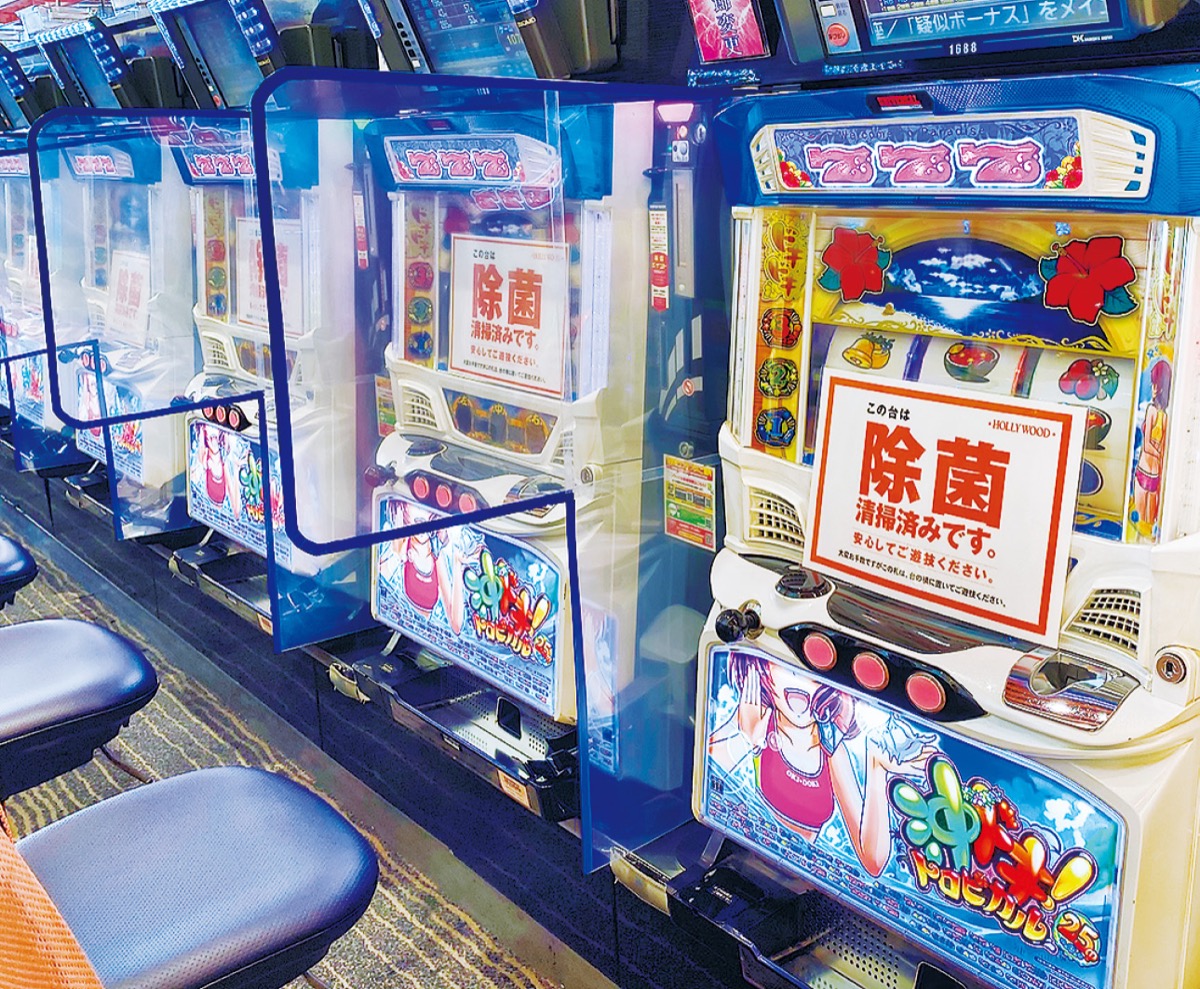 現在は県及び業界で作成したガイドラインに従い、これまでの対策に加え、隣席との間にパーテーション、景品カウンターにはビニールカーテンを設置し、ソーシャルディスタンスの確保に取り組む。