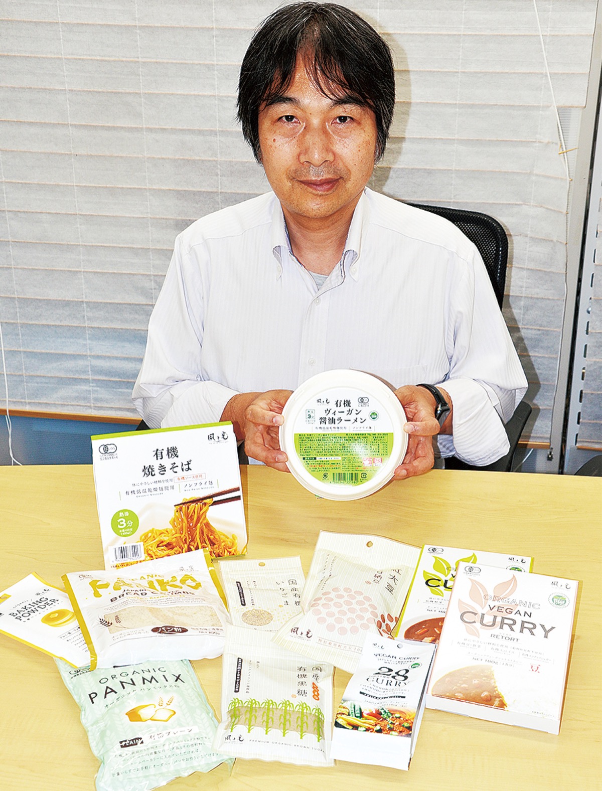 肉や魚介類、卵などの動物性食品を一切口にしない「ビーガン」と呼ばれる食の志向が知られるようになり、対応した製品を販売するスーパーや専門の飲食店も増えてきた。有機食品を扱う風と光=鶴屋町=も、ここ数年でビーガン向けのラインアップを充実。10月からは、有機JAS認定とビーガン認証を受けたカップラーメンとカップ焼きそばの販売を始めた。
