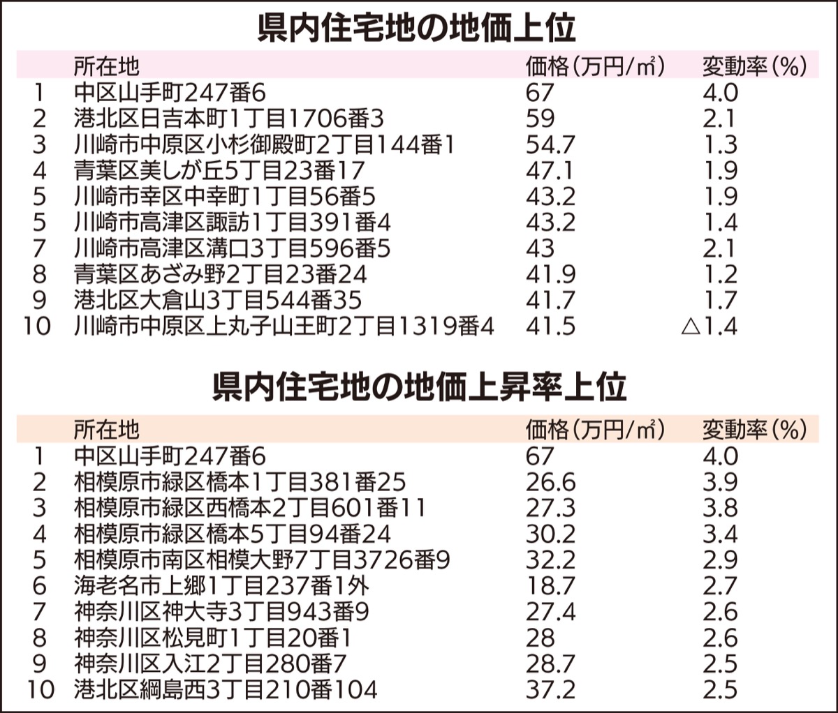 住宅地の地価上位は、1位が「中区山手町247の6」で67万円、2位が「港北区日吉本町1の32の18」で59万円、3位が「川崎市中原区小杉御殿町2の144の1」で54万7千円だった。