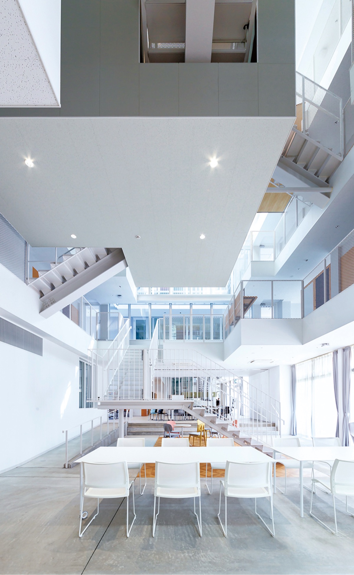 学生寮をデザインしたのは、同校で建築学を学んだオンデザインパートナーズの萬玉直子さん。「まちのような学生寮」をコンセプトに、1階から4階までの吹き抜け部分に複数の階段を設け、踊り場などに少人数で作業や会話を楽しめる共用スペース「ポット」を19カ所配置。留学生や日本人学生が寮生活を通して交流を図り、多様性を体感できるよう工夫した。