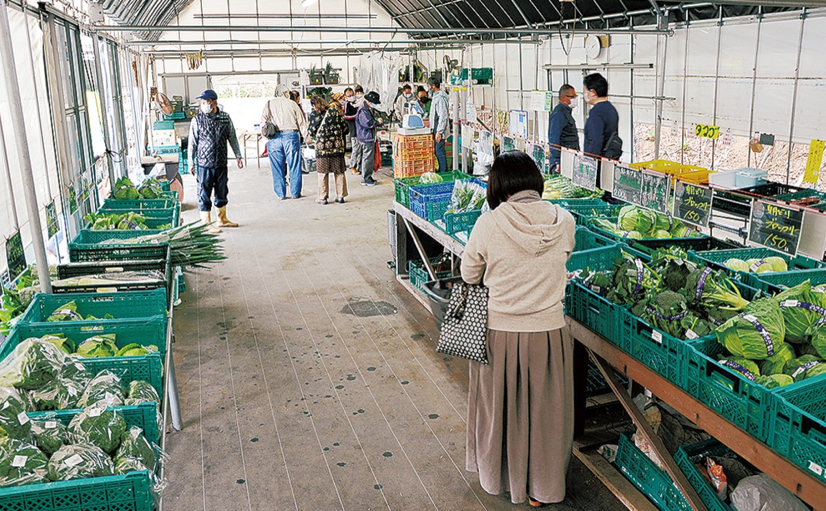 当初は数軒の農家が軽トラックの荷台に野菜を並べて細々と販売していたが、参加農家が増えたことで規模を拡大。今では100平方メートル以上の大型ハウスを建て、20軒の農家が自慢の野菜を販売している。商品には生産者の似顔絵入りのポップが添えられ、常連客の中には「指名買い」をする人もいるという。