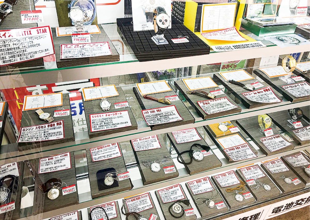 同店では、壊れた時計の修理も受け付けている。メーカーやコンディションを問わずあらゆる時計をよみがえらせる職人の腕を頼り、遠方から訪れる時計愛好家も多いという。「電池交換やバンドのコマ詰めもお受けします。お気軽にお持ちください」と同店。
