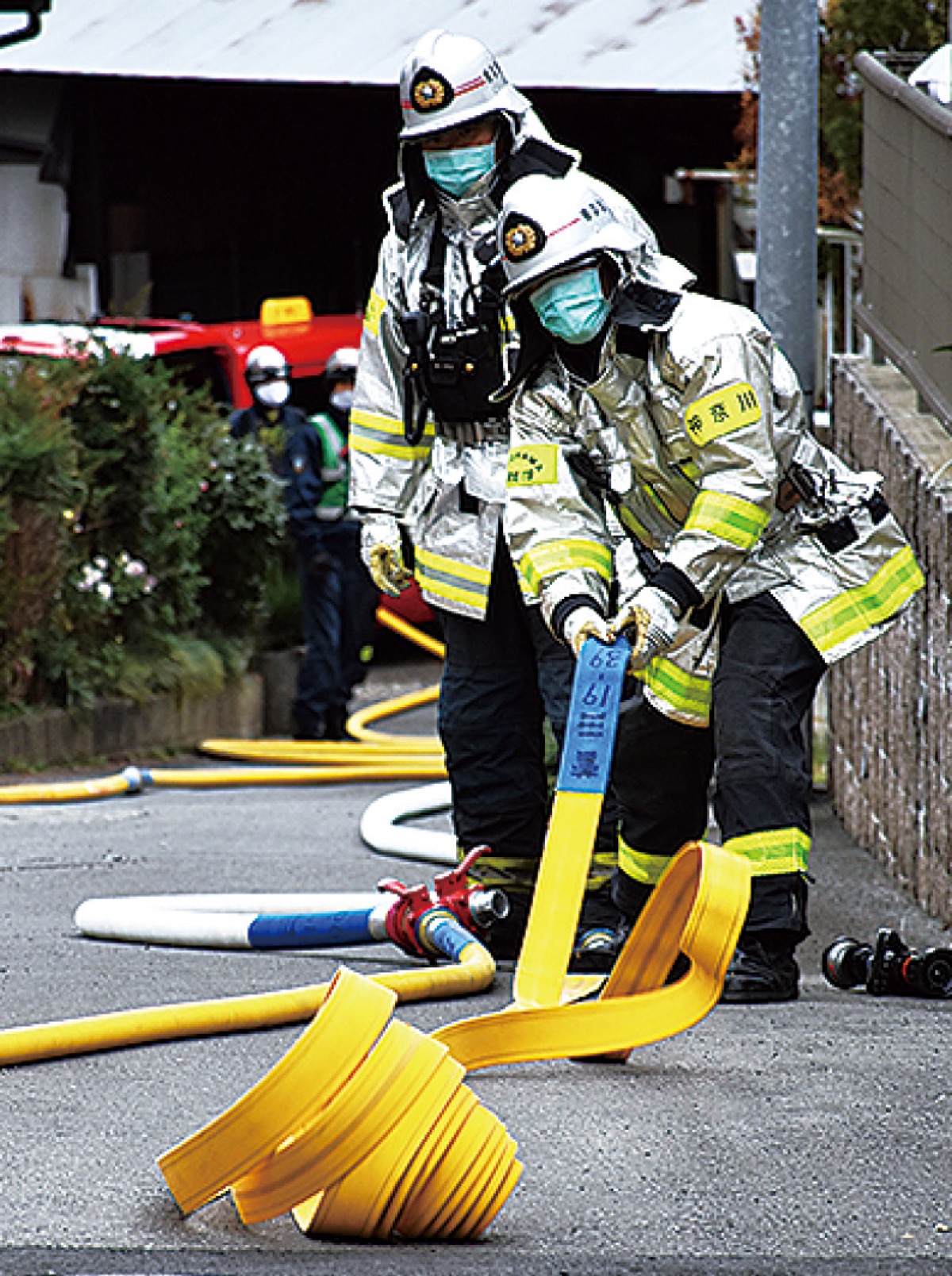 ■菅田の狭あい地域防災訓練/道路の狭い地域での火災を想定。消火用の水を積載する消防車やミニ消防車による直近の消火栓からの放水、近隣老人ホームの防火水槽を活用した放水を実施した。