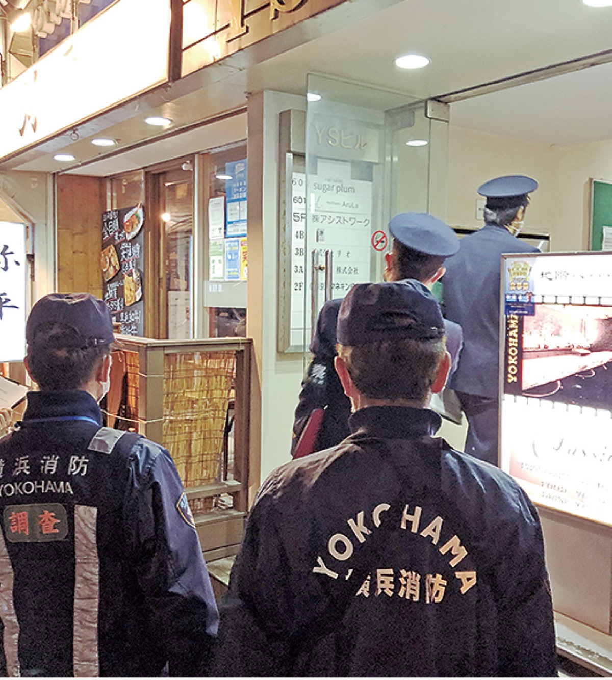 ■横浜駅西口と鶴屋町周辺の夜間査察/消防職員がビル20棟・約100店舗をまわり、避難通路や階段の防火対策状況を確認し、パンフレットを配布して注意喚起した。