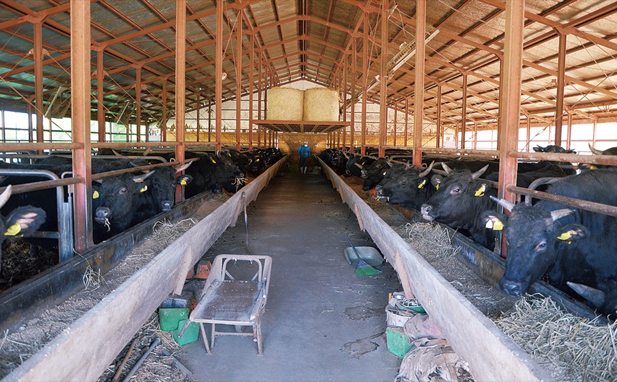 牛舎では、体の引き締まった牛の群れが餌を食べたり寝そべったり。ストレスを与えずのびのびと育てることで、程よい脂の乗った良質な肉質に仕上がるという。「それでも牛には性格があるので、集団の中で力関係が生まれる。強い牛は大きく育つが、弱い牛は餌を食べず小さいまま」(洋右さん)と、1頭1頭の成育を見守るために連日牛舎に通い詰める。