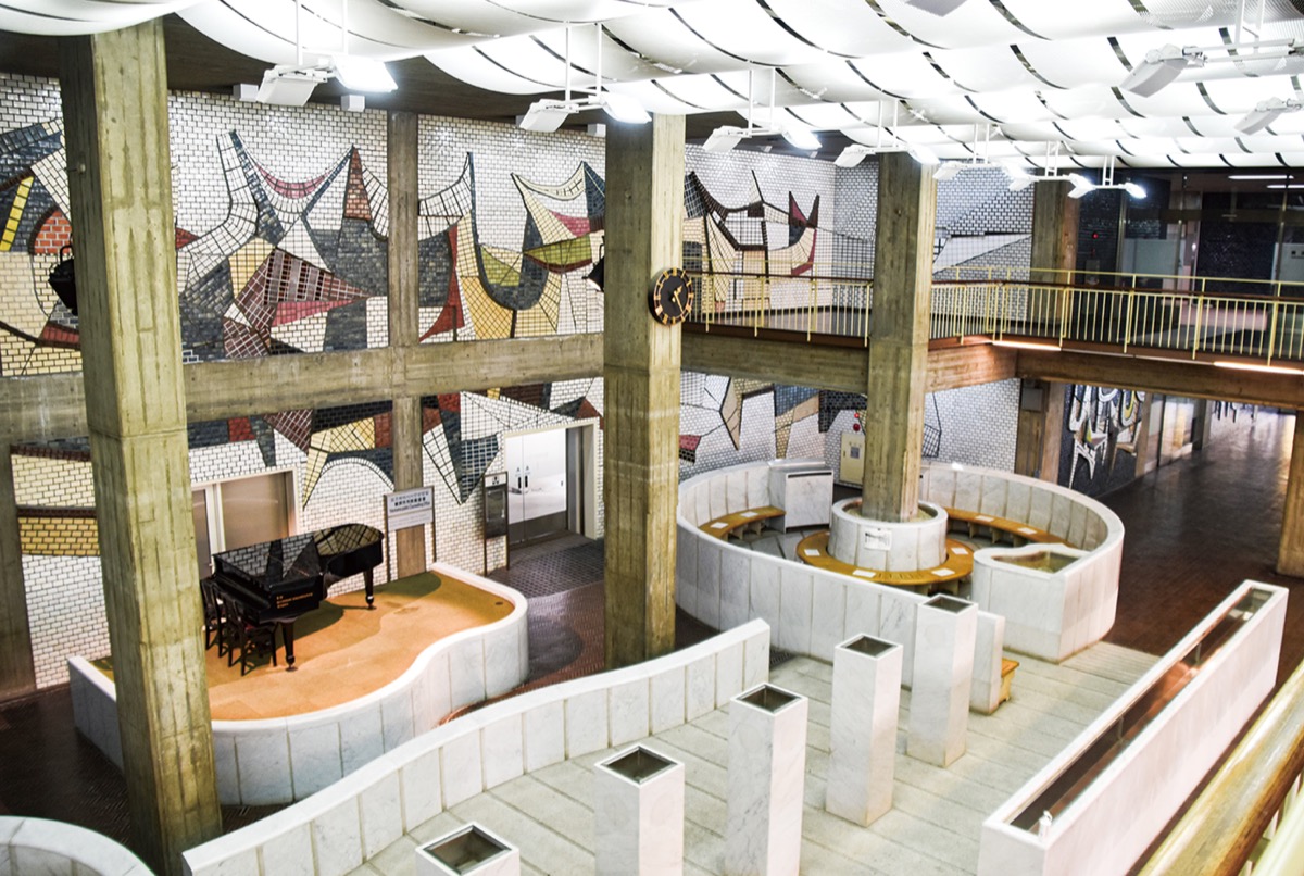 設計コンペでは、この大空間が行政棟と市会棟をつなぎ、市職員や議員との公的な接触の場となるという思想が評価され、村野案が選ばれた。また、村野氏と良く協働していたという彫刻家、辻晋堂氏のレリーフ「海・波・船」が壁一面に広がり、来庁者の目を楽しませていた。