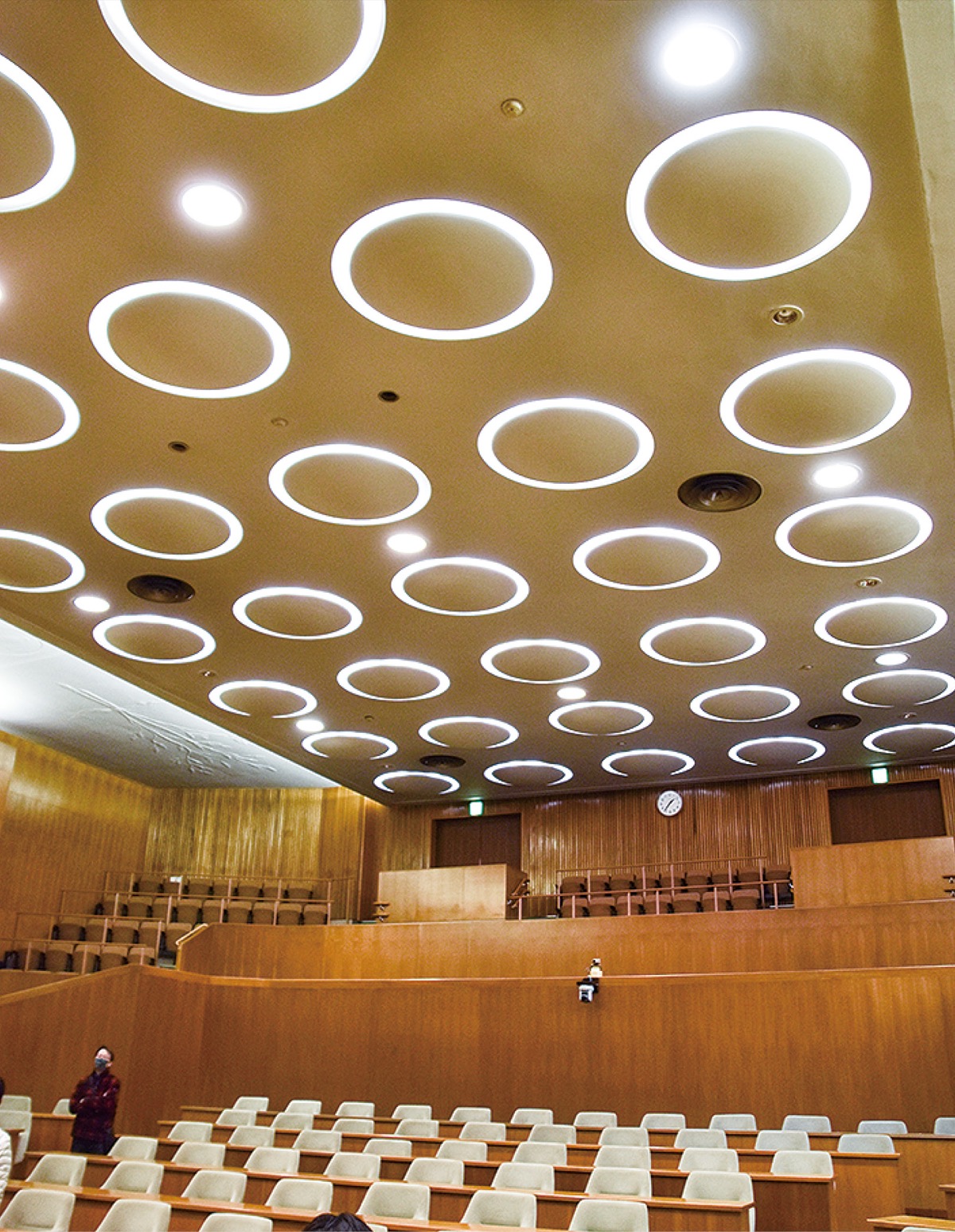 議場は、木のパネルの壁面とそれに合わせた机で、木のぬくもりを感じる空間。天井の円状照明が特徴的だ。都内から参加した高田洋子さんは「市会棟の取り壊しはもったいない。村野氏の設計物を海外の人にも見せたかった」と悔しさをにじませていた。