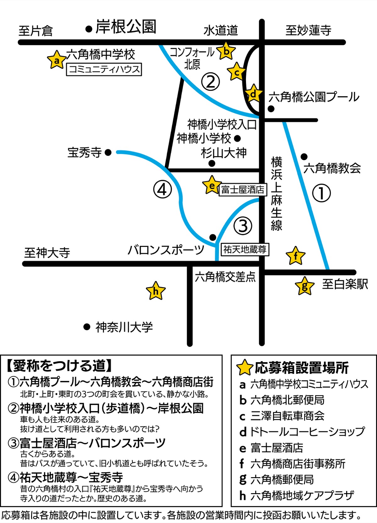 愛称を募る道は、【1】六角橋プール〜六角橋協会〜六角橋商店街、【2】神橋小学校入口(歩道橋)〜岸根公園、【3】富士屋酒店〜バロンスポーツ、【4】祐天地蔵尊〜宝秀寺。応募用紙に名称と理由・思いを記入して応募箱に投函する。用紙に記載された応募フォームからも参加できる。応募は1人1枚まで。