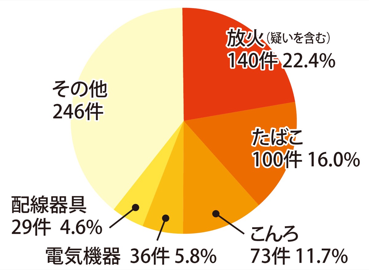 火災種別では、建物火災の380件(60・9%)のうち住宅火災が266件で、前年より8・8%増加して7割に上った。主な出火原因の上位は、「放火(疑いを含む)」が140件(22・4%)、「たばこ」100件(16・0%)、「こんろ」73件(11・7%)だった。