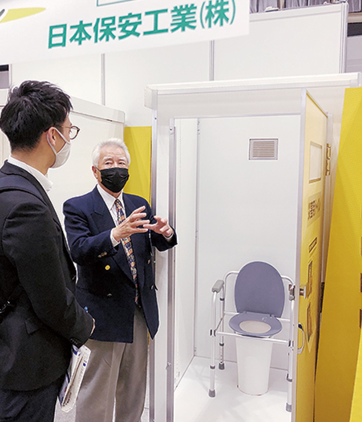 区内から参加した日本保安工業=新子安=では、避難所で活用できる仮設式トイレや間仕切り製品などを紹介した。