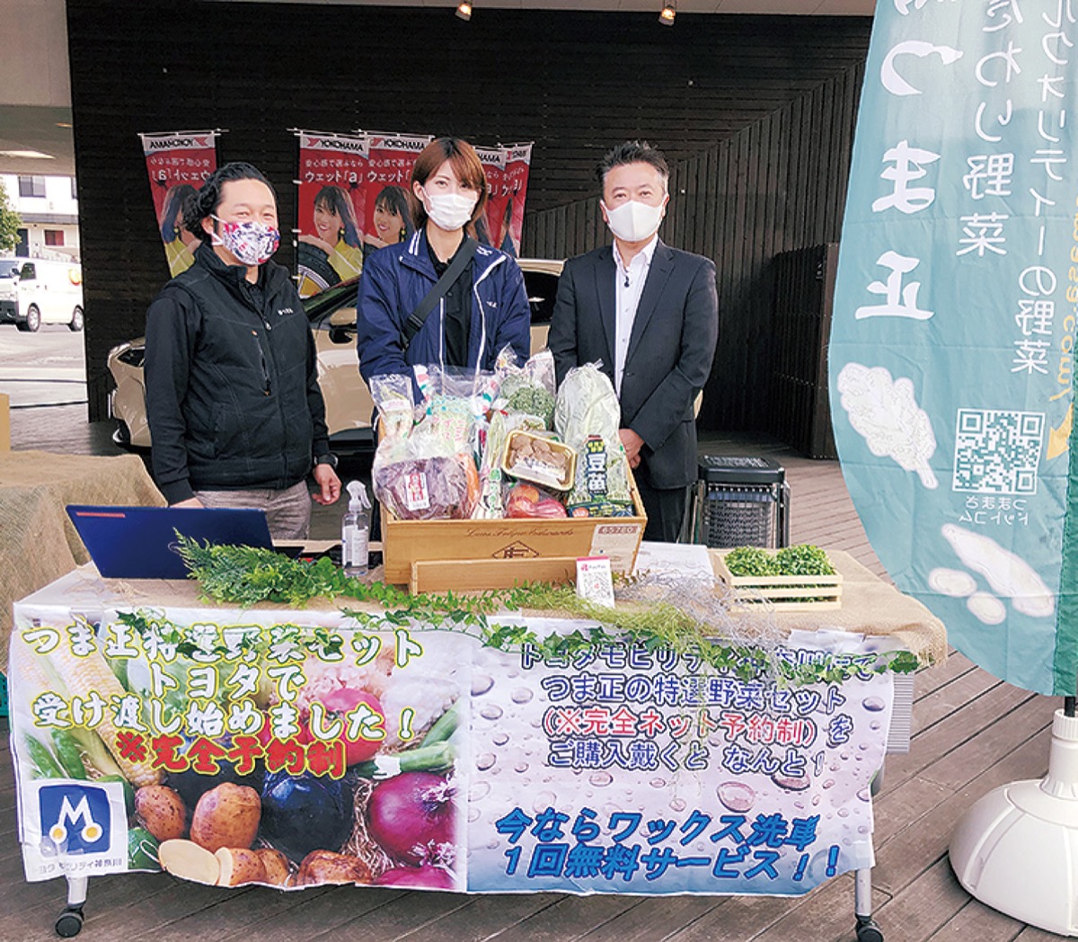 野菜卸売業者「つま正」が、県内のトヨタ系ディーラー14店舗で野菜販売に取り組んでいる。