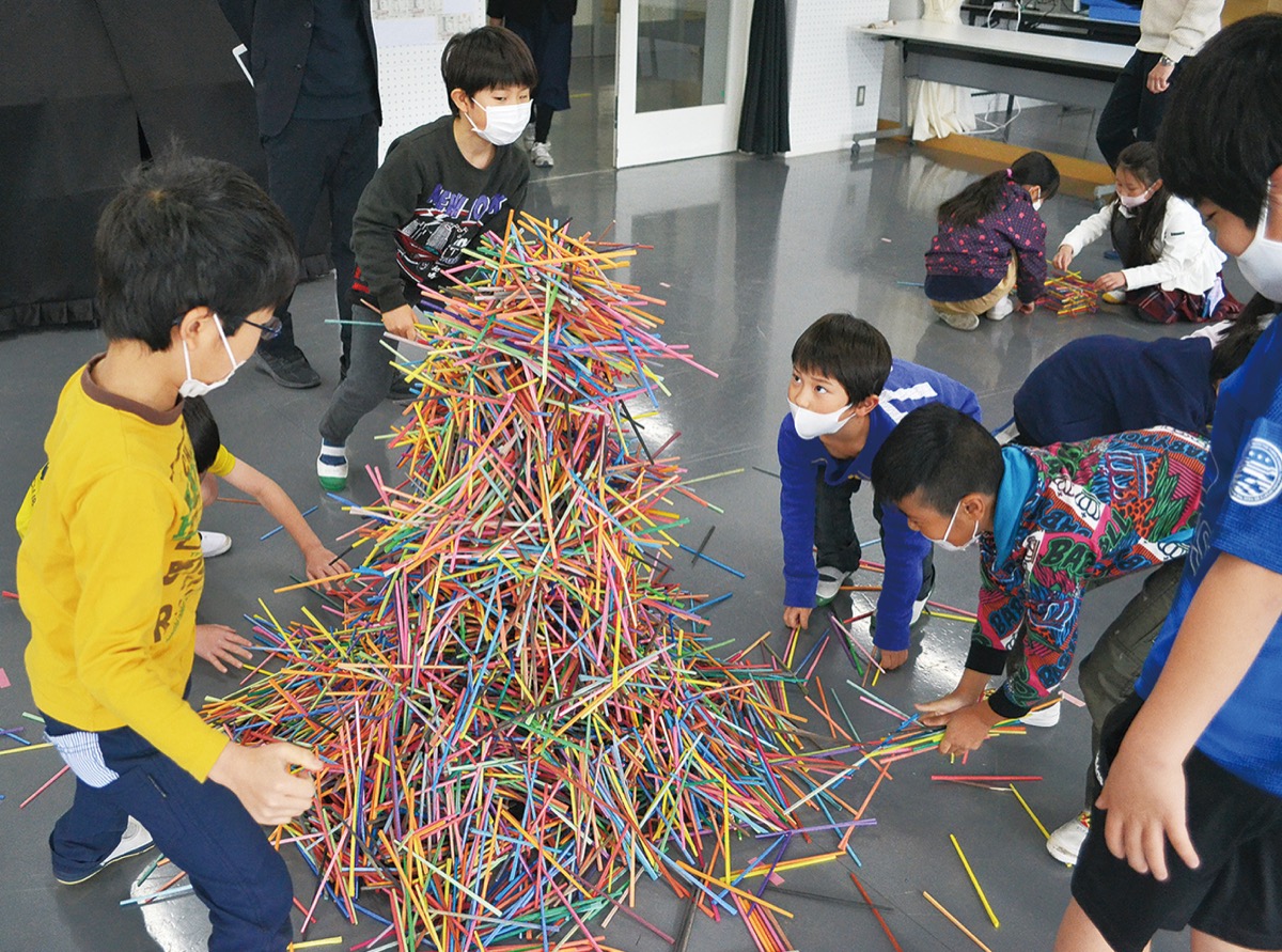 「カラフルスティックワークショップ」と題し、児童は色のついた割り箸を使って高い塔を作るアート表現に挑戦。白百合女子大学の椎橋元貴准教授による指導のもと、単独で高い塔を作ることから始めて徐々に複数人で協力しながら制限時間内に棒を積み上げた。2年3組ではクラス全員で作品を完成させことができたという。
