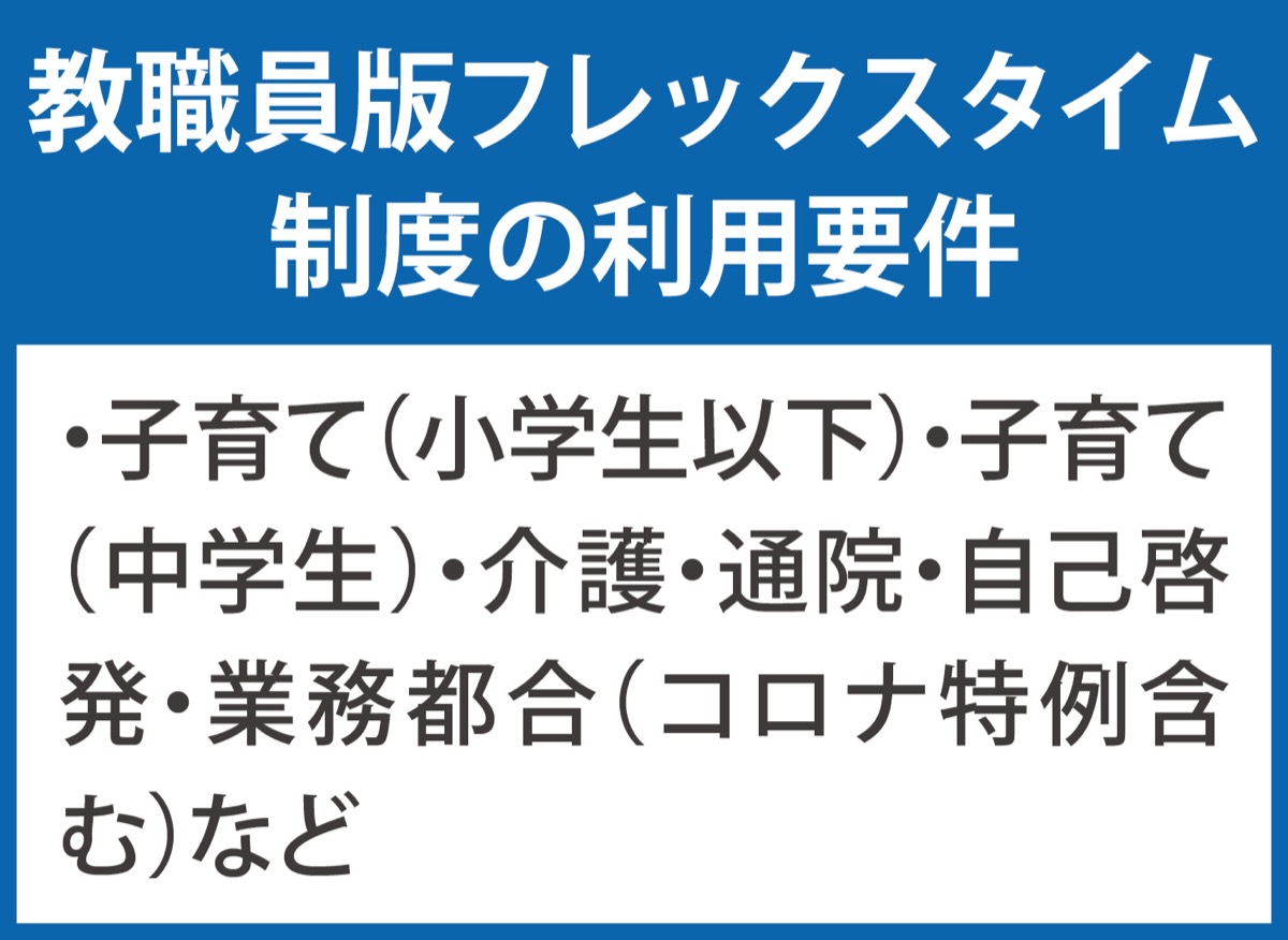 子育てとの両立のために同制度を試行段階で活用した中学校の女性教諭は、「保育施設に迎えに行ける時間が早くなり、子育てに余裕ができた。フレックス制度を活用しやすい雰囲気がさらに高まれば」と期待する。市の担当者は「活用する教職員の状況を踏まえながら制度を充実させていきたい」と話した。