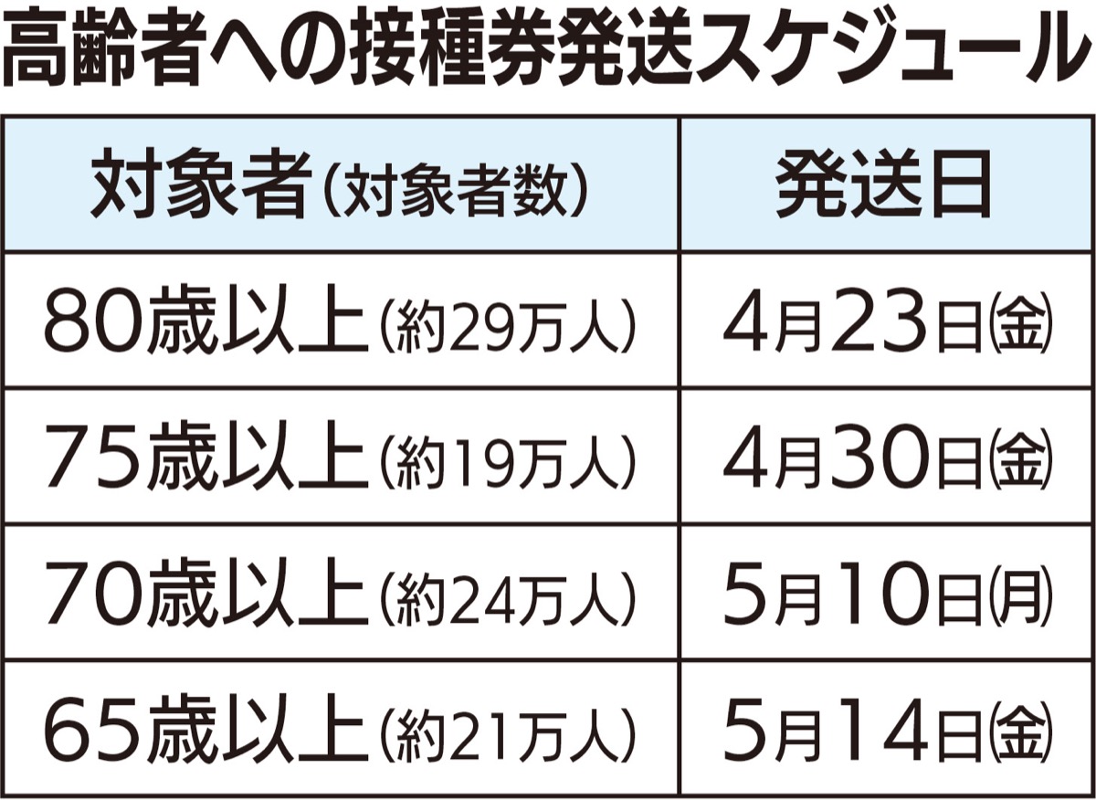 これによると、80歳以上(対象約29万人)には4月23日から、75歳以上には30日(同19万人)、70歳以上(同24万人)は5月10日、65歳以上(同21万人)は14日から接種券や予診票などを同封した個別通知を発送する。