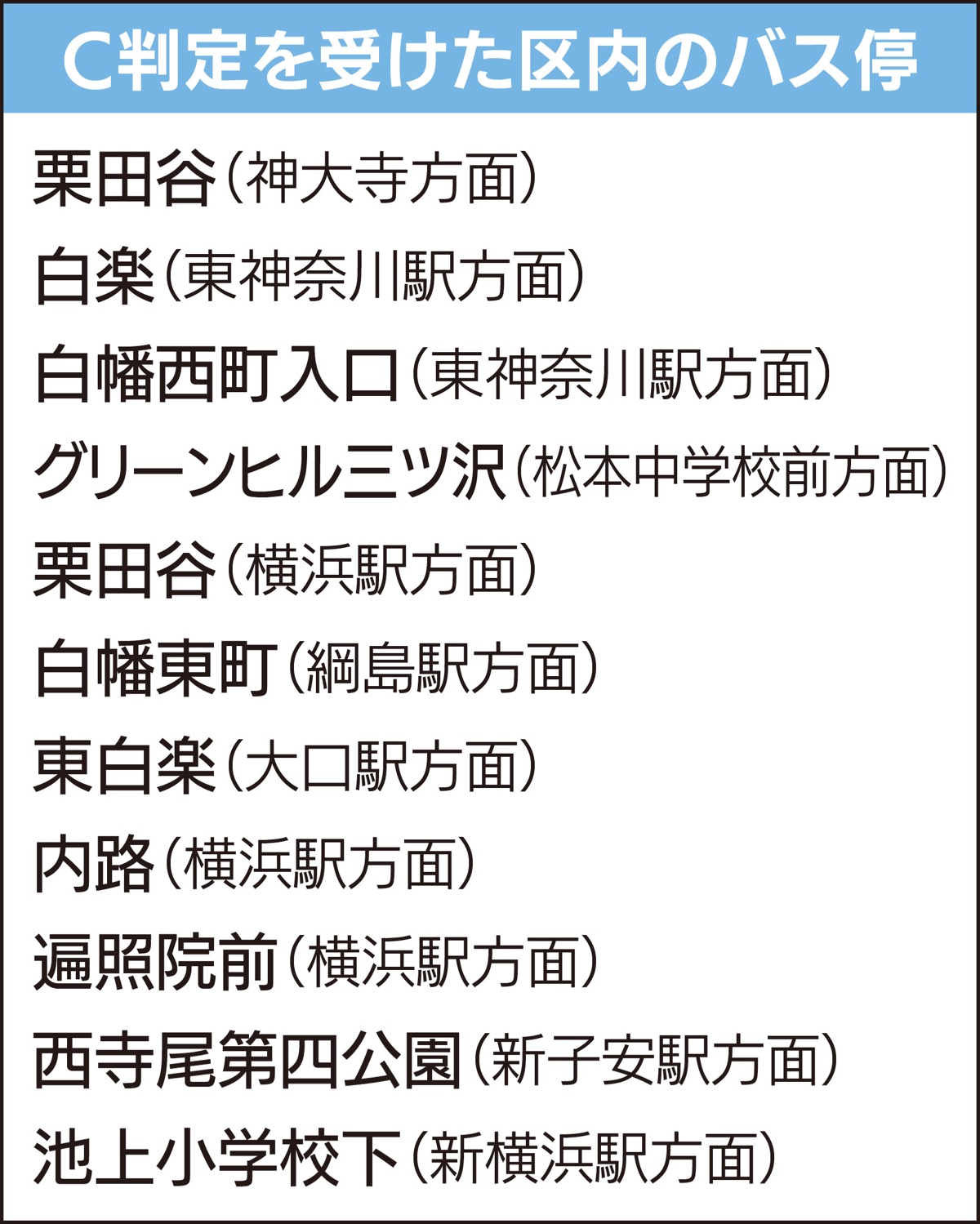 B判定を受けた区内のバス停は、▽旭硝子入口(鶴ケ峰駅方面)=羽沢町=▽中村(横浜駅方面)=菅田町=▽小川橋(横浜駅西口方面)=同=▽滝坂(新子安駅方面)=子安台=の4カ所。いずれも停車したバスが交差点にかかるか、横断歩道の前後5メートルの範囲内となる位置にバス停が設置されている。交差点の前後5メートルの範囲に停車したバスがかかる、またはそれ以外の危険性があるC判定は11カ所だった。