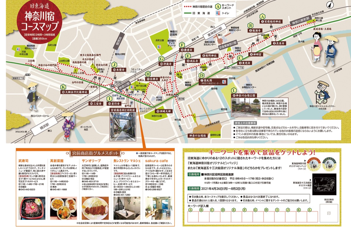上台橋=台町=から神奈川通東公園=新町=まで、旧東海道沿いに整備された「神奈川宿歴史の道」(全長約4・3Km)を舞台に実施。コース上の寺社など12のスポットに隠されたキーワードを集めると、神奈川宿をモチーフにしたピンバッジか東海道五十三次「神奈川台之景」がプリントされた海苔がもらえる。