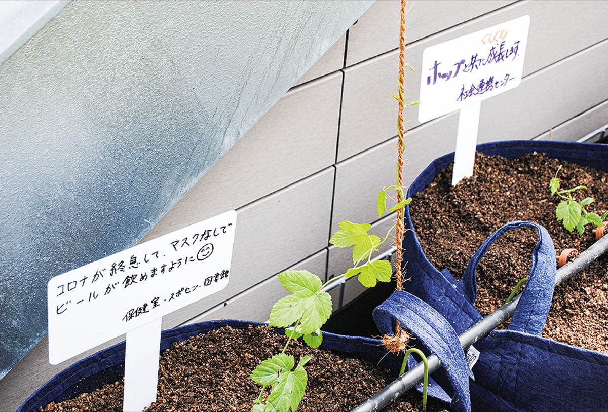 14日にはキャンパスの職員らが参加してホップ苗の植え付け作業が行われ、6階テラス階段に計10鉢のプランターを配置した。今後は雑草取りなどの管理を行いながら、(株)Root=南足柄市=が提供するホップ栽培のコミュニティアプリ「THANKS HOP&BEER」と連携て生育状況を発信していく。