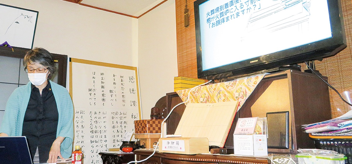 寺に寄せられる相談に耳を傾けるだけでなく、専門家と連携することで実務的に対応しようという勉強会「さきゆきケア」が6月14日、なごみ庵=平川町=で行われた。初開催となった昨年秋に続く開催の今回は、行政書士・ファイナンシャルプランナー・葬祭カウンセラーとして活躍する勝桂子さんが「直葬したらどうなるの?」をテーマに講話を行った。