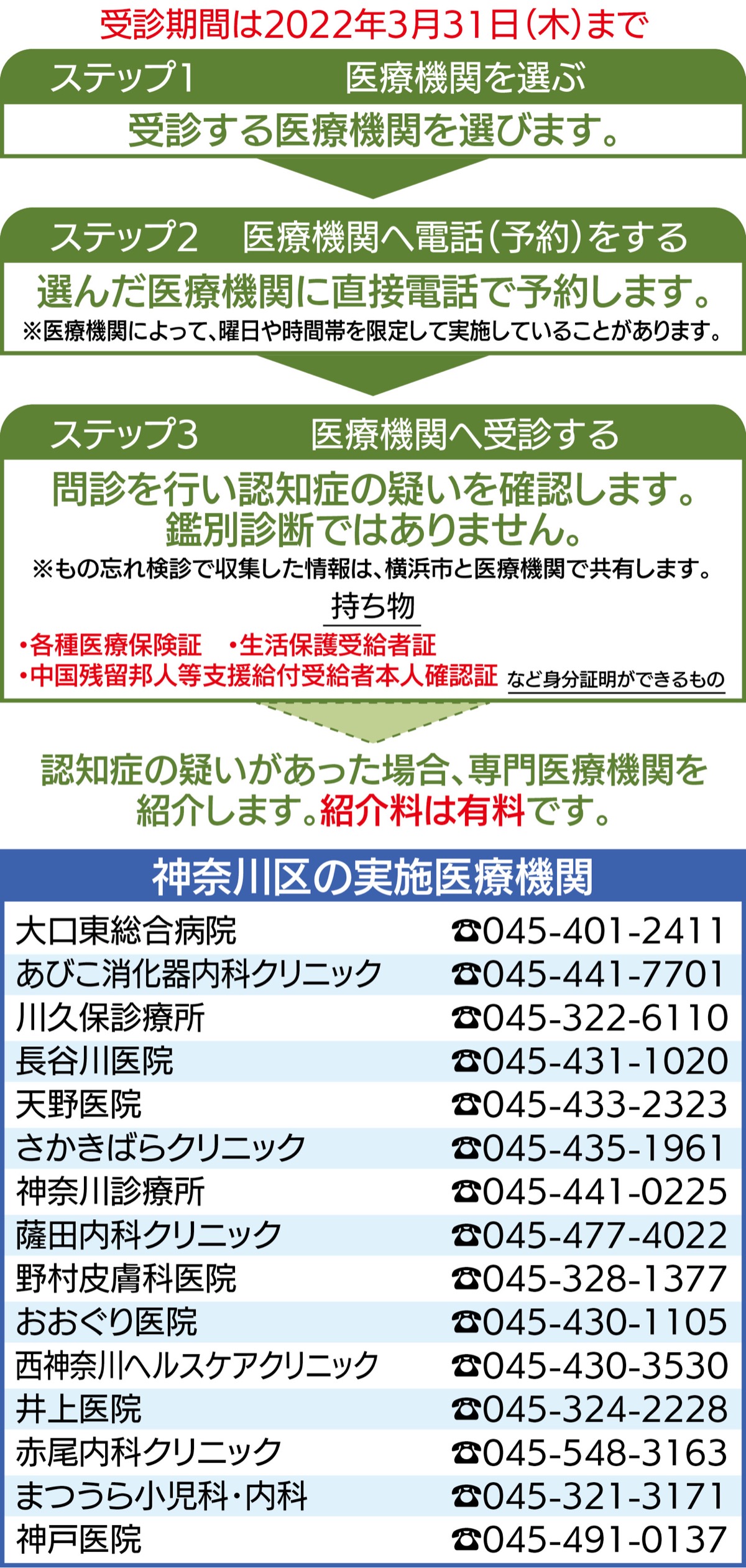 もの忘れ検診は、認知症診断を受けたことのない65歳以上の市民が対象。市内168カ所の医療機関で予約をして受診する。2022年3月31日まで受診可能。