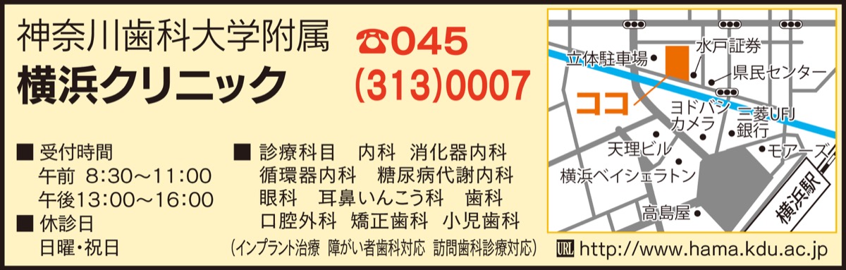 神奈川歯科大学附属横浜クリニックは2002年に開設し、眼科・耳鼻いんこう科・内科(一般内科・消化器内科・循環器内科・糖尿病代謝内科)・歯科などで構成。近年全身疾患と歯科疾患と関連性が指摘される中で、医科歯科が連携した医療機関として地域医療に根差してきた。