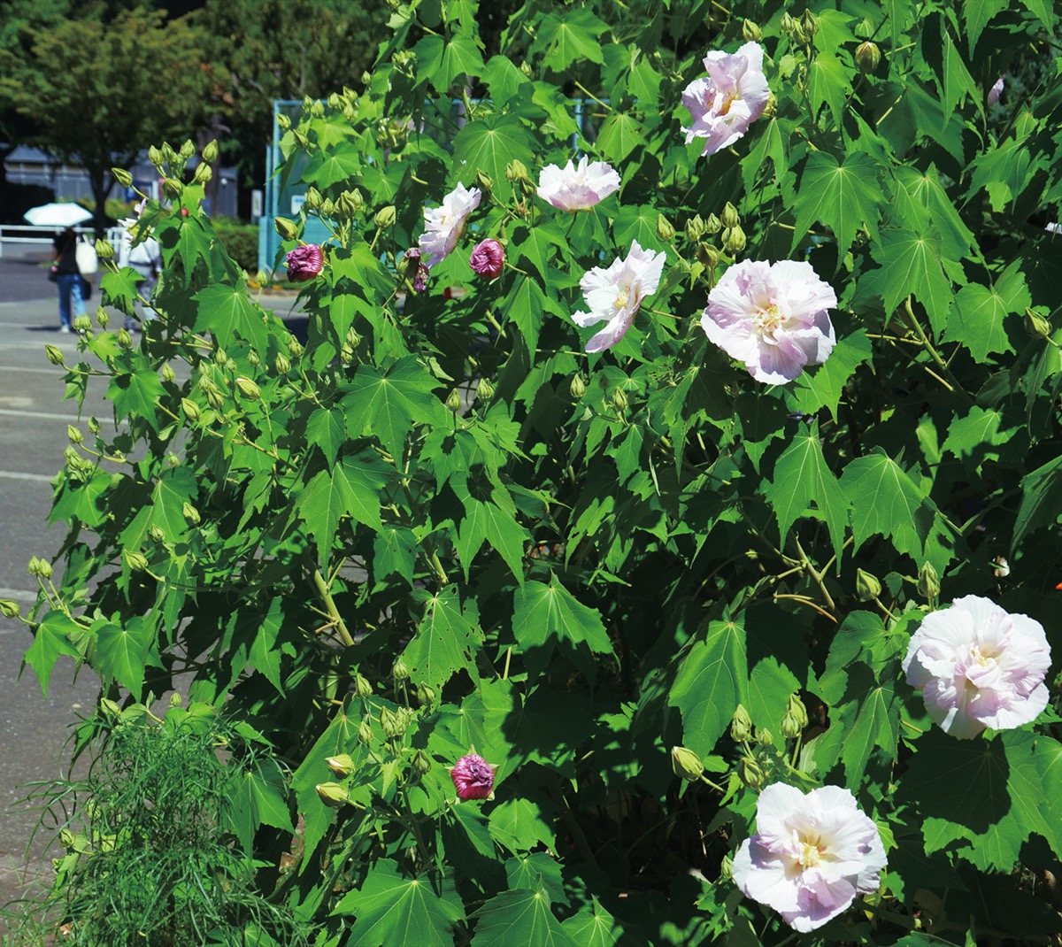 三ツ沢公園=三ツ沢西町=の戦没者慰霊塔側にあるテニスコートそばに整備された花壇広場で、8月上旬から酔芙蓉(すいふよう)の花が咲き始めた。