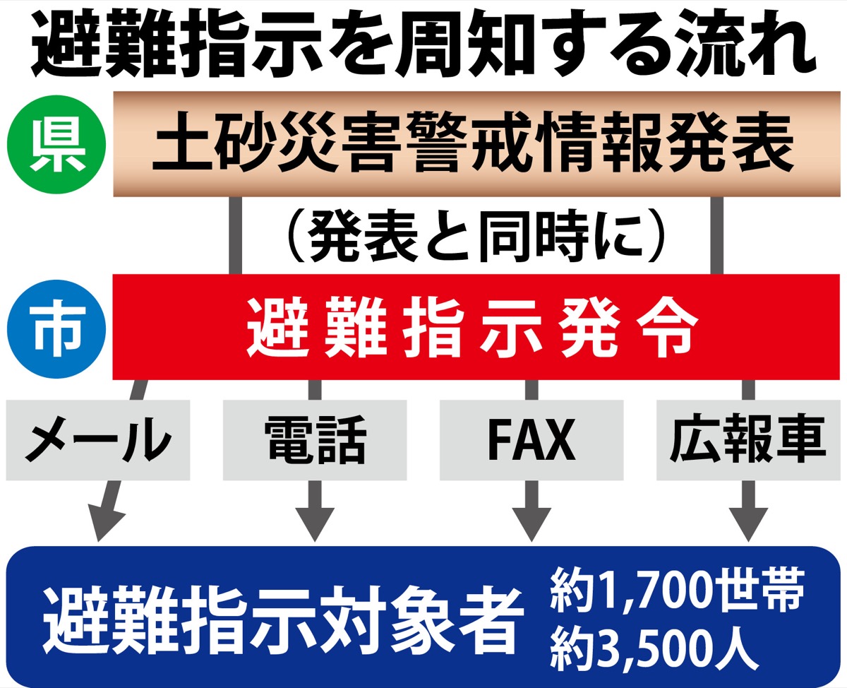 市の発表によると、7月3日午前1時15分に県から同警戒情報が発表され、対象区域の1693世帯、3512人に避難指示を出した。対象世帯にはメールやFAX、電話のアナウンスなどで指示が出たことが伝わる仕組みになっている。