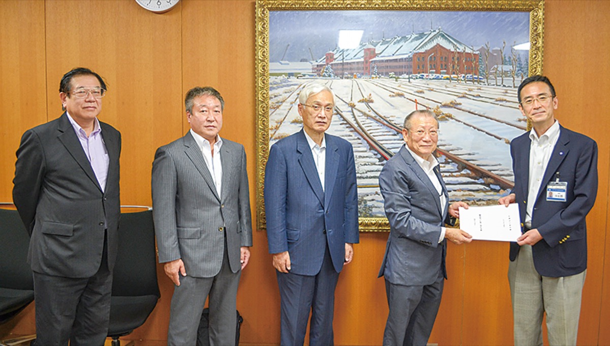 横浜商工会議所北部支部の小山正武支部長などが9月29日、神奈川区役所を訪れ、「横浜市政に関する要望書」を日比野政芳区長に手渡した。