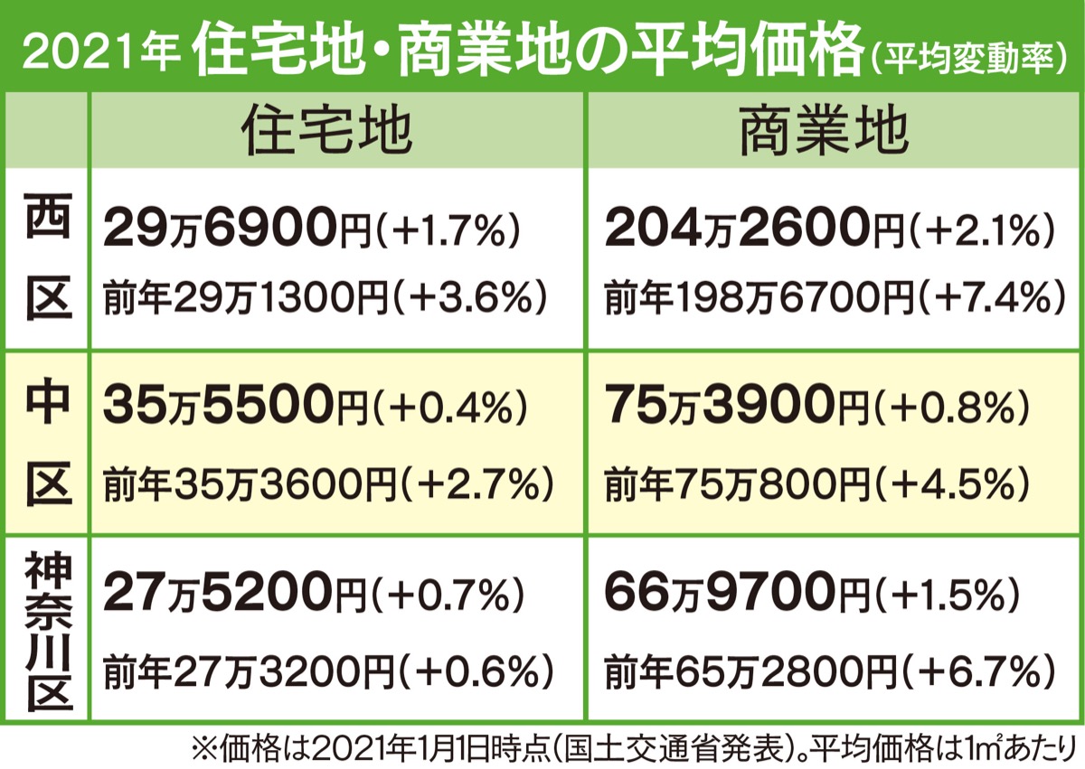 国交省が公表した2021年1月1日時点の横浜市の公示地価では、平均変動率は住宅地でマイナス0・2%となったが、西区で1%以上の上昇がみられた。中区・神奈川区を含む6区は1%未満の上昇を維持した。また、神奈川区の入江1や羽沢南3のエリアでは、羽沢横浜国大駅が開業した影響で2・5%上昇している。