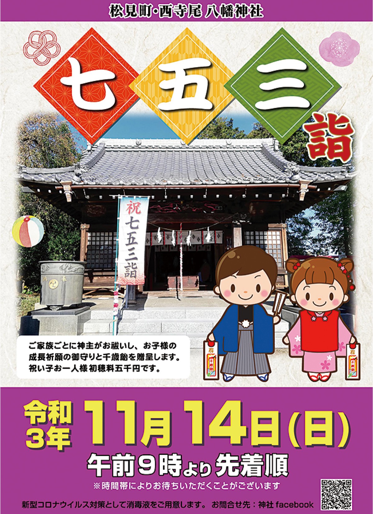本殿の写真を背景に着物姿で笑顔を見せる子どものイラストを据え、「今年のポスターは、よりシンプルにデザインして七五三詣が楽しくわかりやすいようにしました」と氏子総代。若い世代にも地域の神社に関心を持ってもらおうと、同神社のフェイスブックにアクセスできるQRコードも入れた。