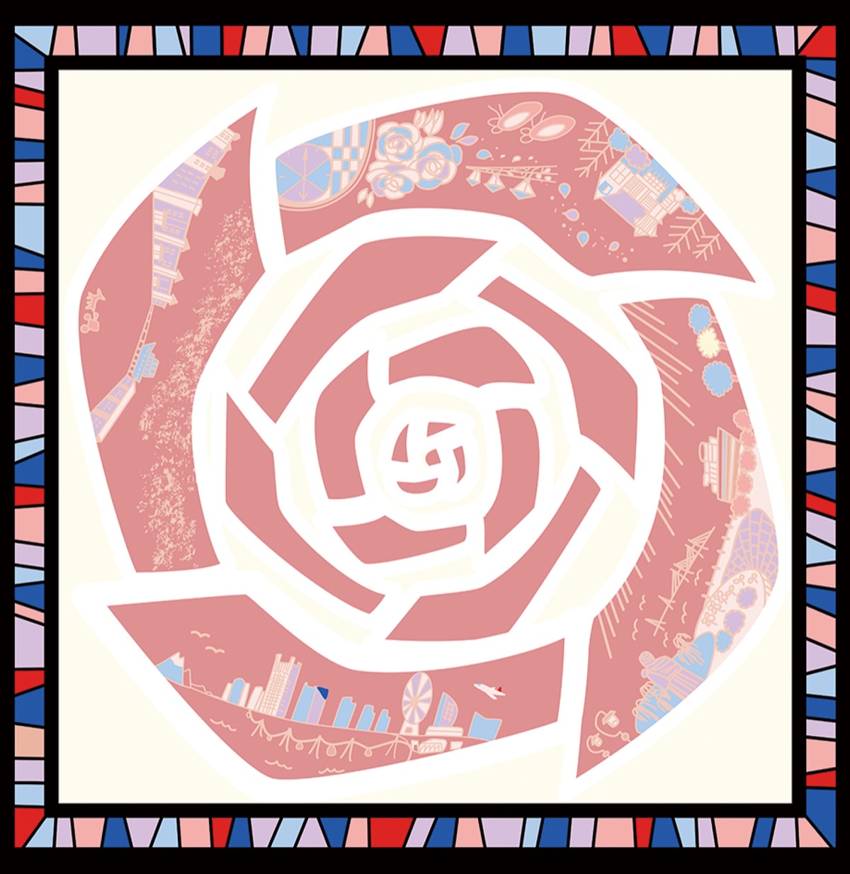 スカーフの中央には市の花であるバラが大きく描かれ、花びらの中にみなとみらい21地区や横浜ベイブリッジなど市内の名所があしらわれている。絹産業の普及に取り組む横浜繊維振興会が「手捺染(てなっせん)」と呼ばれる伝統的な染色技術を用いて製品化した。
